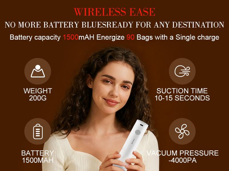 Mini Cordless Electric Pump: 1500mAh battery, 50uses per charge. Powerful suction powers in about 25seconds. Durable PA+PE material with double zipperseals protects clothes from dirt, ensuring long-term usewithout leaks.